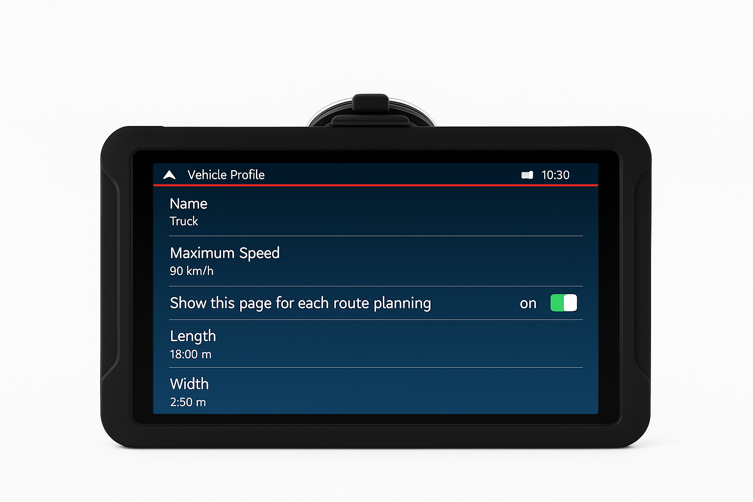 Advanced Vehicle Settings – configure length, width, height, weight, axle count, and cargo type (including hazardous materials).