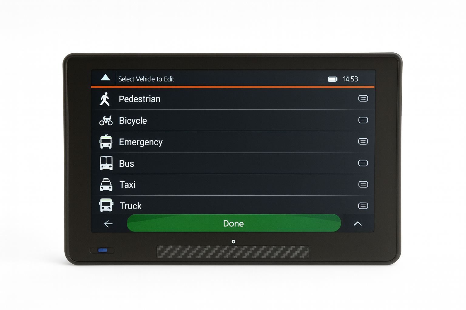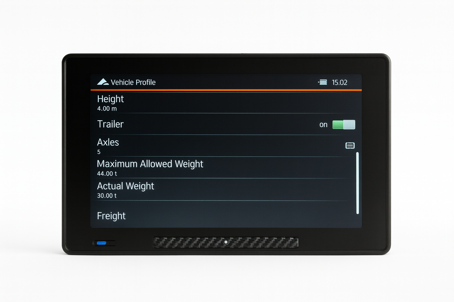 Advanced Vehicle Settings – configure length, width, height, weight, axle count, and cargo type (including hazardous goods).