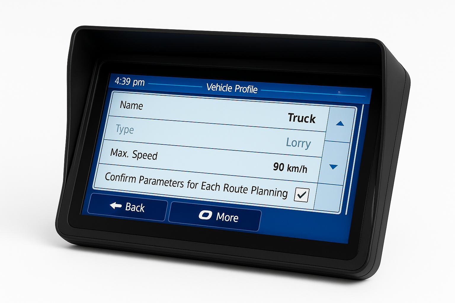 Advanced vehicle settings for trucks, buses & campers: length, width, height, weight, axles, with/without trailer, cargo type (gas, hazardous goods, explosives, etc.)